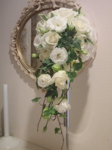 白いバラとバラ咲きのトルコキキョウとアイビーを組み合わせたごくシンプルな花材ですが とても品質のよい花が入荷できたので存在感あるキャスケードブーケをお届けできました(^v^)